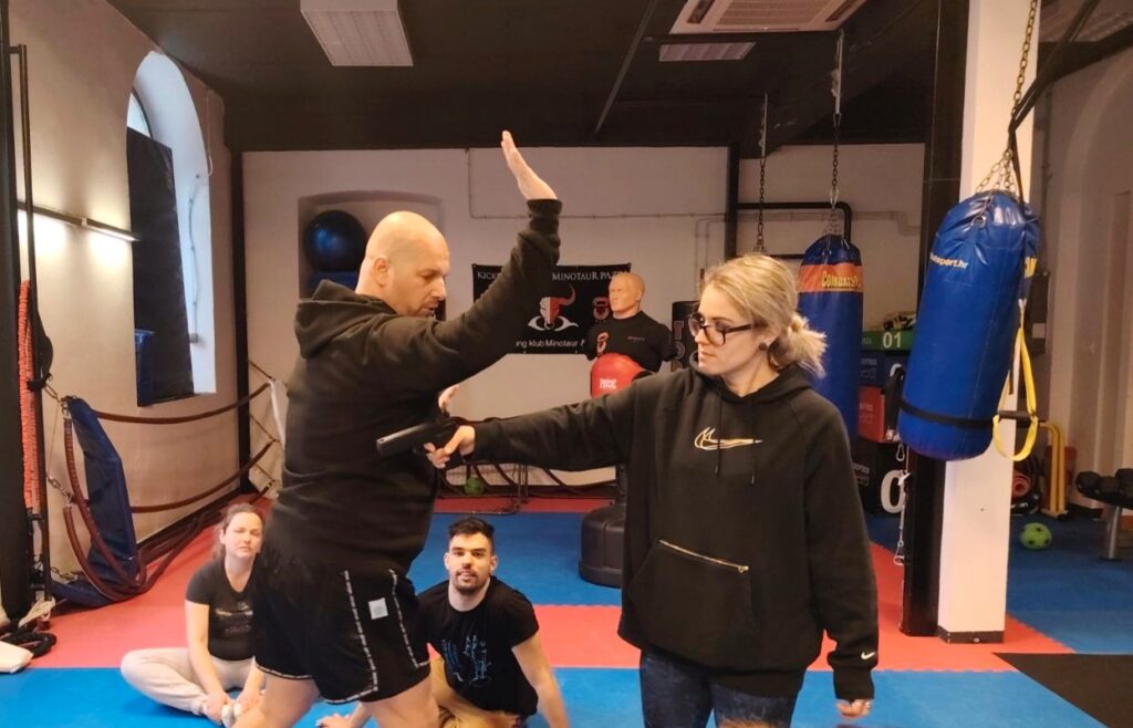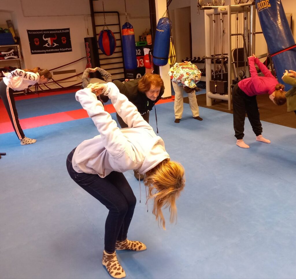 Po drugi put skočili smo do Pazina, gdje smo zajedno s Kickboxing klubom Minotaur & Gym Pazin te Udrugom Motus Vita Est nastavili s radom na našoj fizičkoj kondiciji. Uz pomoć trenera Denisa Matejčića i fizioterapeutkinje Lane Demark isprva smo se zagrijali trčanjem i preskakanjem prepreka, a zatim istegnuli. Nakon usvajanja boksačkog stava, nastavili smo vježbati udarce direkt lijevo-desno sa i bez rukavica, ali i udarce nogom. Usput smo naučili i nekoliko tehnika samoobrane za koje se nadamo da nećemo morati koristiti, no ne škodi ih znati. U svakom slučaju, bilo je fascinantno vidjeti uživo kako to rade profesionalci!